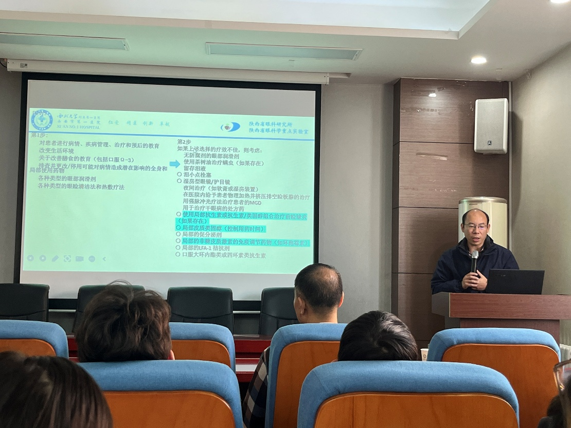 首先,肖研究员进行了题为“干眼的抗炎药物治疗及研究进展”的精彩讲座。肖研究员详细阐述了干眼的发生机制、临床应用的各种抗炎药物以及目前国内外在此领域的最新研究进展。他通过大量的临床案例和前沿研究数据,深入剖析了干眼症的发病机理、诊断方法和治疗策略。此外,肖研究员还重点介绍了他们研究团队针对干眼开发的创新药物以及在临床实践中积累的经验和心得。
