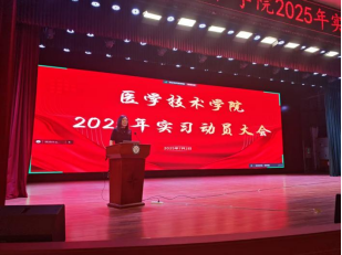 为提升学生实践能力与综合素质,深化学生对实习重要性的认识,确保实习实践活动圆满完成,7月2日上午,医学技术学院在学校学术报告厅召开2026届毕业生实习动员大会。学院党总支书记任向明、院长孙静、党总支副书记徐景彩、教学科科长郭璞、学生科科长刘慧、毕业班辅导员及全体实习学生参会。会议由副院长王莉主持。