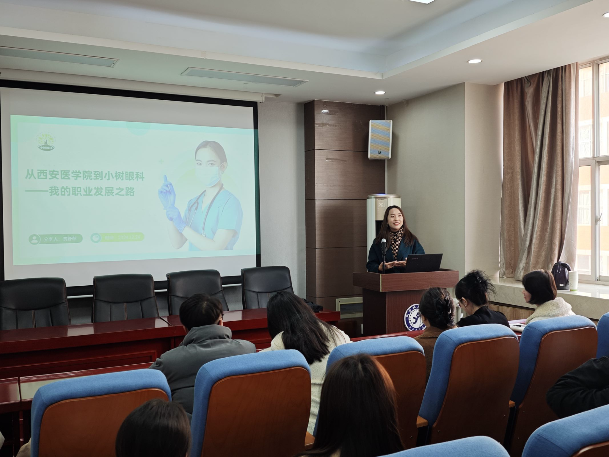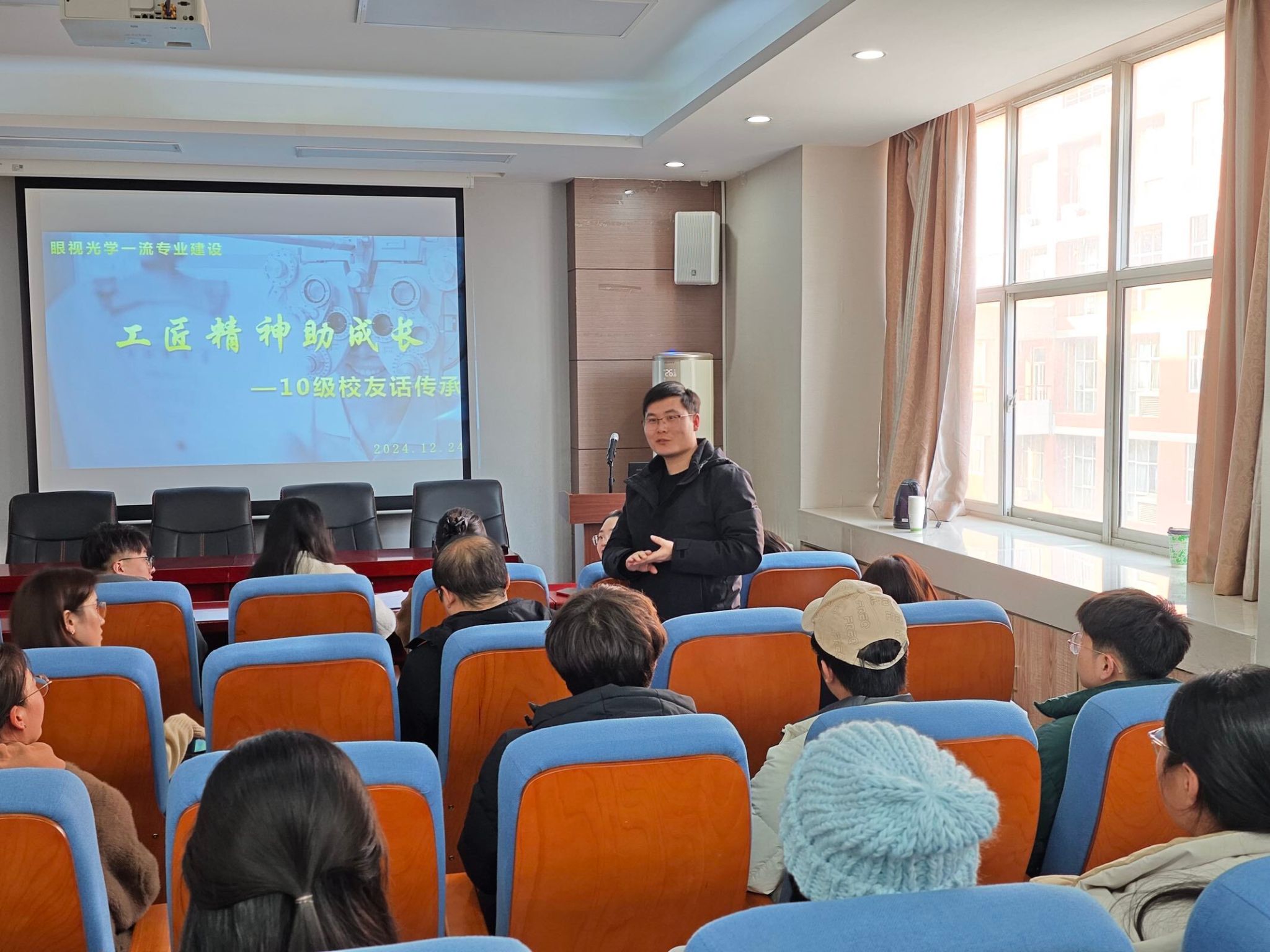 12月24日下午,在医学技术学院三楼报告厅眼视光学专业迎来了一场意义非凡的“工匠精神助成长”系列活动—“10级校友话传承”,此次活动的举办旨在搭建一座桥梁,连接过去与未来,让校友的宝贵经验成为在校学生成长道路上的灯塔,同时也为校友们提供一个重温校园时光、共谋专业发展的平台。本次参会人员有眼视光学2010级优秀毕业生代表、眼视光学专业全体教师、2024级新生代表及2022级全体学生。
