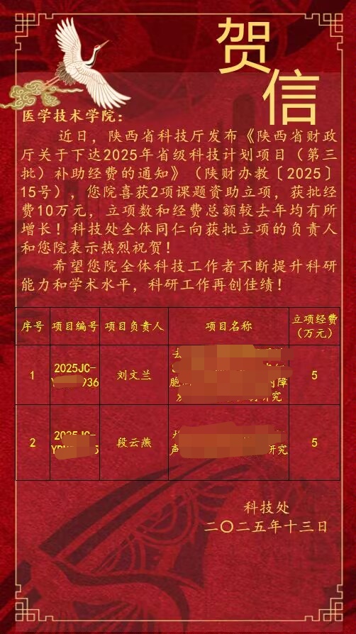 日前,省科学技术厅发布了《陕西省财政厅关于下达2025年省级科技计划项目(第三批)补助经费的通知》(陕财办教〔2025〕15号),我院获批省级科技计划项目课题2项,经费10万元。