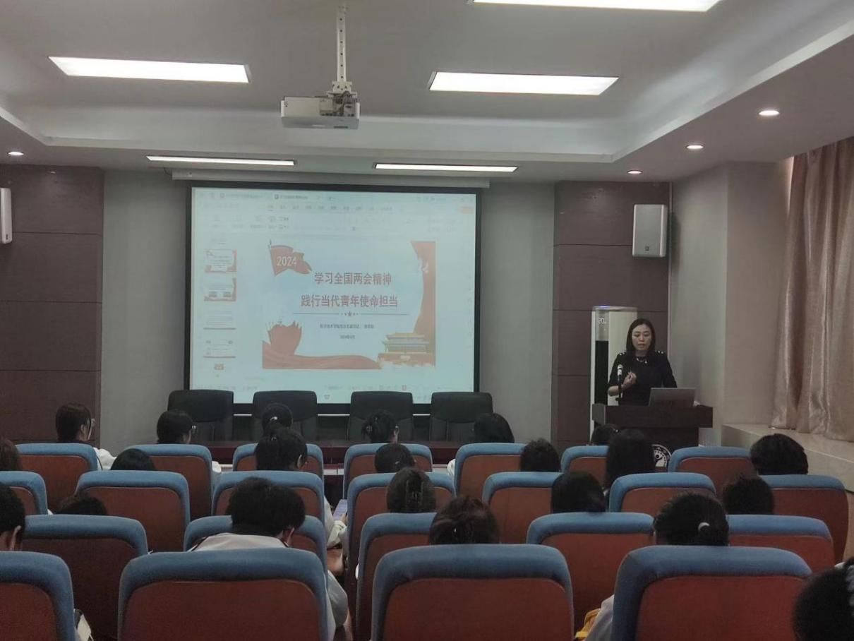 徐景彩从“两会”召开的背景、基本情况、热点问题入手,重点阐述解读了政府工作报告中对2023年工作回顾以及2024年重点工作任务,使党员学生了解了国际国内形势,认清大局,增强“四个自信”。同时,她对全体学生党员就如何把学习两会精神与践行使命担当充分结合提出四点要求,一是要增强理想信念,把民族复兴与个人发展紧密相连,以行动自觉彰显当代青年的使命与担当。二是要树立正确的学习观,热爱学习、学会学习,做到持久学、终身学,练好“基本功”,耕好“责任田”,守好“主阵地”。三是要树立全局观,不做“井底之蛙”。要学会从全局高度思考问题,脚踏实地,全面提升综合素质。四是要学会在理论和实践的转化中提高本领。要积极参与社会实践和志愿服务活动,在实践中磨砺自己、提高本领。